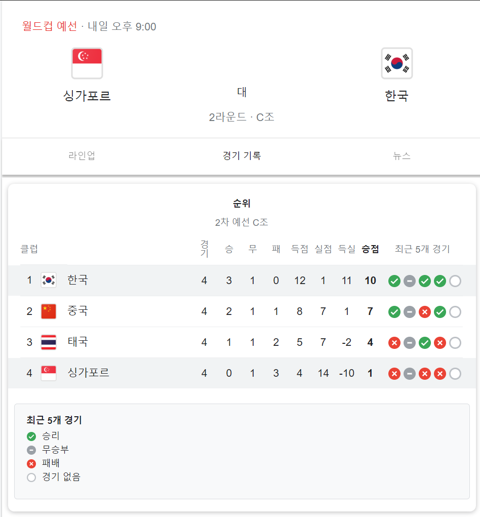 대한민국 싱가포르 축구 일정
