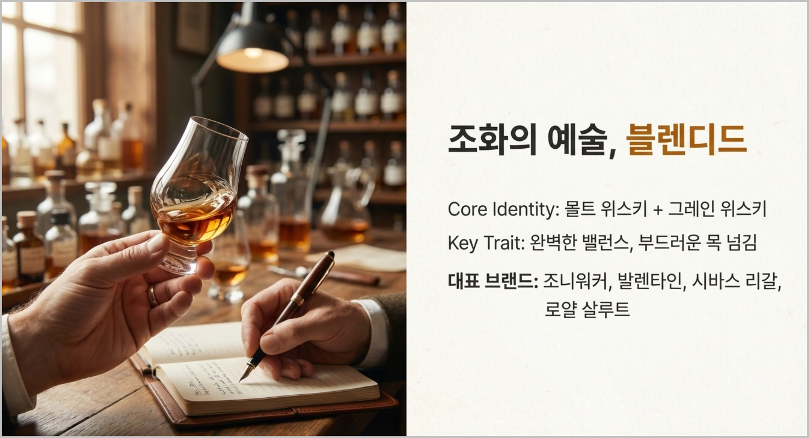 - 정의: 개성이 강한 몰트 위스키와 대량 생산이 용이한 그레인위스키(옥수수, 밀 등)를 섞어 만든 위스키입니다.