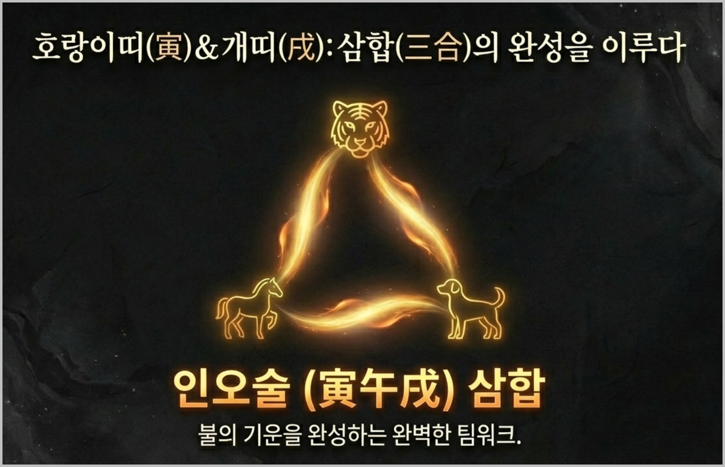 - 이유: 호랑이, 말, 개는 '인오술(寅午戌) 삼합'이라 하여 불의 기운을 완성하는 완벽한 팀입니다.