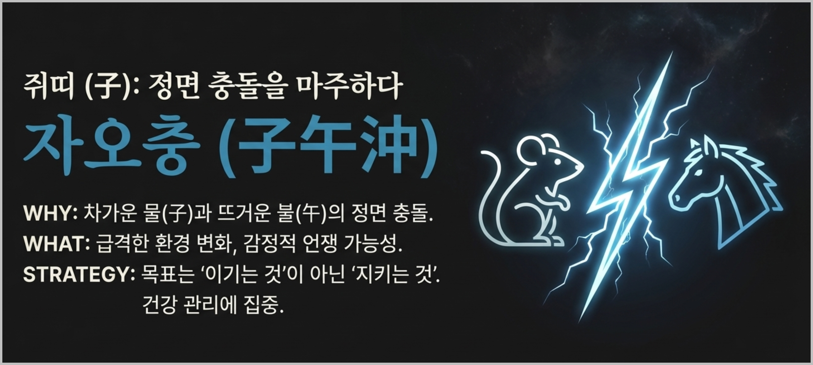 - 이유: 차가운 물(쥐)과 뜨거운 불(말)이 정면으로 부딪치는 '자오충(子午沖)'의 해입니다. 기존에 하던 일이 뒤집히거나, 직장/주거의 급격한 변동이 생길 수 있습니다. 특히 감정적인 언쟁을 피하고, 심혈관 계통 등 건강 관리에 힘써야 합니다. "이기는 것보다 지키는 것"이 목표가 되어야 합니다.